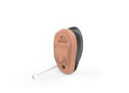 Custom hearing aid that fits in the ear canal. A smaller portion of the hearing aid shows in outer ear.